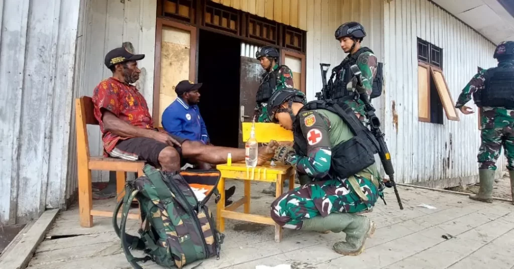 Dalam memberikan pelayanan kesehatan kepada masyarakat di wilayah Papua tim kesehatan Satgas Yonif Raider 321/GT/13/1 Kostrad Pos Ramil Yigi bereaksi cepat mengobati masyarakat yang sedang terluka di Distrik Yigi Kabupaten Nduga, Papua (24/08/22).
