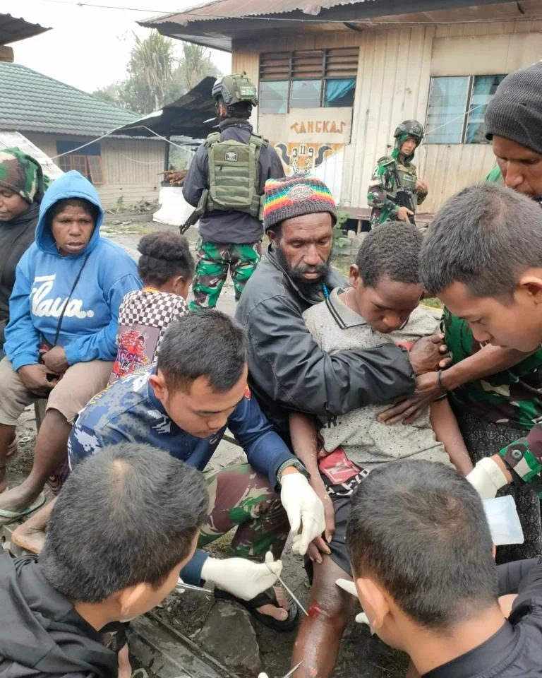“Tim Kesehatan Pos Dal Satgas Satuan Organik Yonif Raider 321/GT langsung memberikan penanganan medis mulai dari membersihkan lukanya, namun karena lukanya terbuka cukup besar dan terus mengalami pendarahan sehingga tim medis mengambil tindakan untuk menjahit luka tersebut sebanyak 9 jahitan,” ucap Lettu Inf Fachri Toisutta.