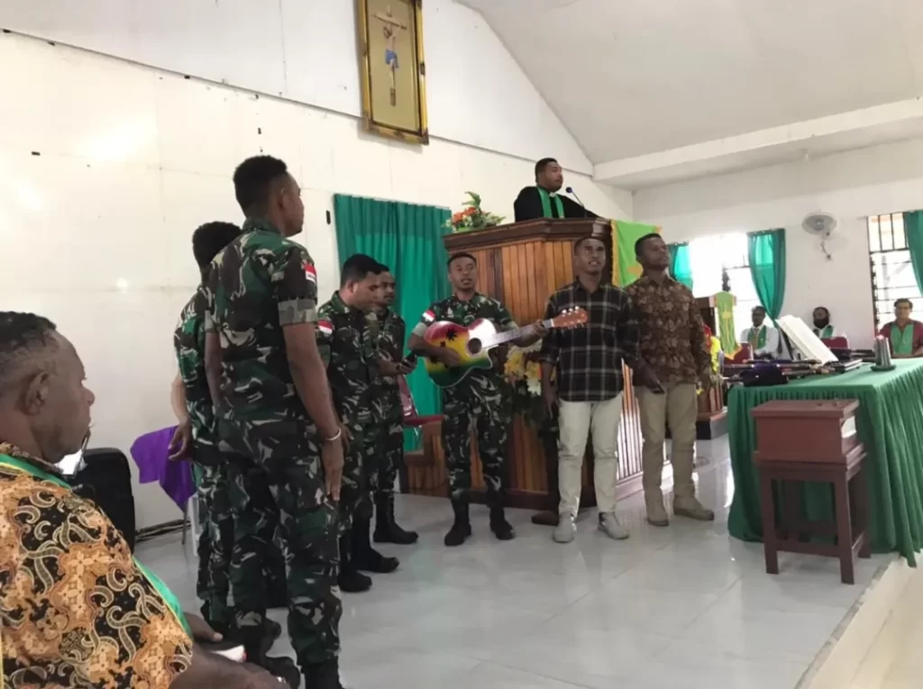Kenyam – Kodim 1715/Yahukimo melalui 8 personel Babinsa Koramil 1715-07/Kenyam tampil untuk mengisi ibadah minggu dengan beberapa lagu pujian yang diiringi musik dari organ tunggal di Gereja Bethel GKI Kenyam, Distrik Kenyam, Kab. Nduga, Minggu (21/8).