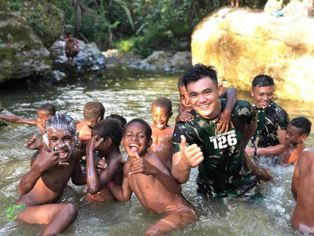 Kondisi sungai yang bersih dan masih natural, dimanfaatkan oleh personel Satgas untuk mengajak sejumlah anak-anak yang biasa bermain di Pos, untuk bermain ke sungai yang jaraknya tidak terlalu jauh dari Pos Satgas.