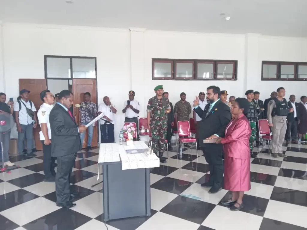 Kenyam – Dandim 1715/Yahukimo Letkol Inf Johanes V. Tethool menghadiri pelantikan dan pengambilan sumpah jabatan Plh. Sekretaris Daerah Kab. Nduga yang dipimpin langsung oleh Pj. Bupati Nduga Namia Ngijangge, S.Pd, M.Si, bertempat di Aula Kantor Bupati Kab. Nduga, Distrik Kenyam, Kab. Nduga, Rabu (21/9).