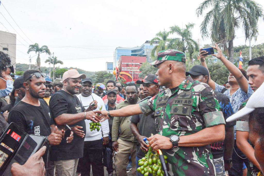 Jayapura – Di tengah aksi demonstrasi yang dilakukan massa yang mengatasnamakan Koalisi Rakyat Papua (KRP) Save Gubernur Papua Lukas Enembe di Kota Jayapura, Danrem 172/PWY Brigjen TNI J.O Sembiring turun membagikan pinang dan minuman gratis kepada pendemo, Selasa (20/9).