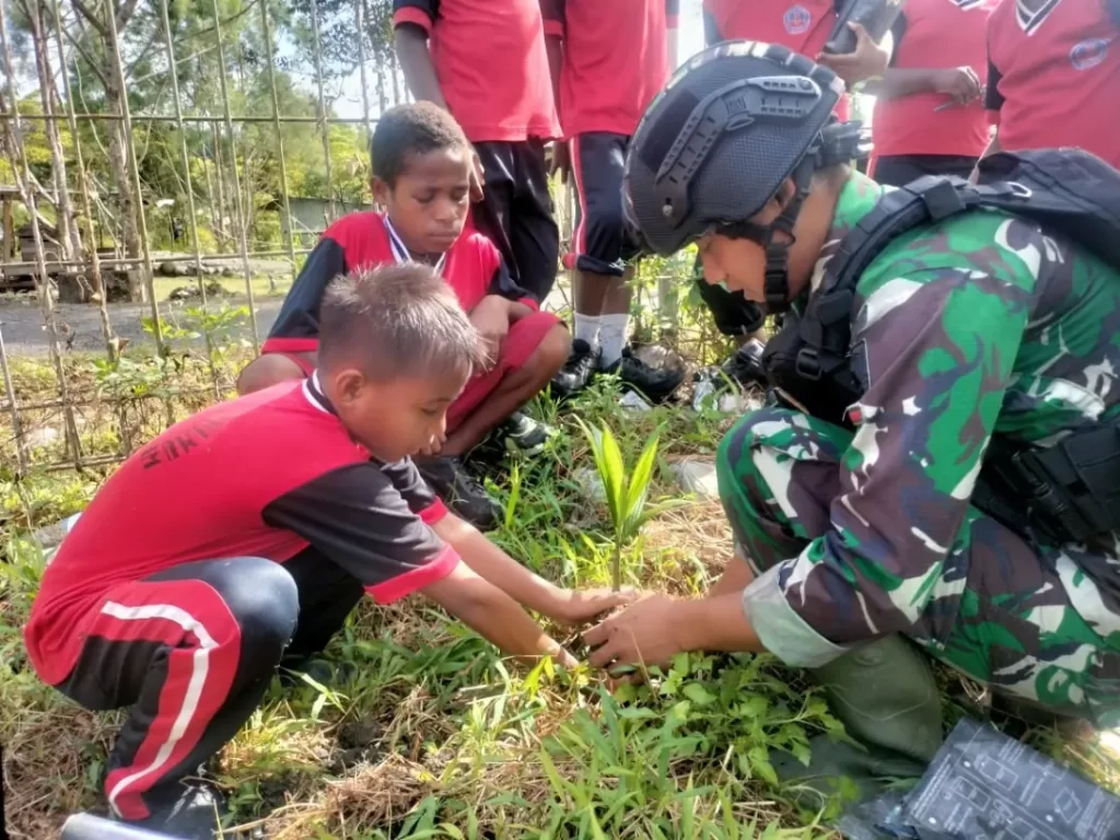 Para personel Satgas yang di Pimpin langsung oleh Perwira Seksi Administrasi Logistik satgas Pamtas RI-PNG Yonif Raider 142/KJ Letda Inf Iswan Harahap bersama 10 orang Personel Pos Kotis mengajak anak-anak sekolah melakukan penanaman bibit pohon pinang di areal sekolah mereka masing-masing.