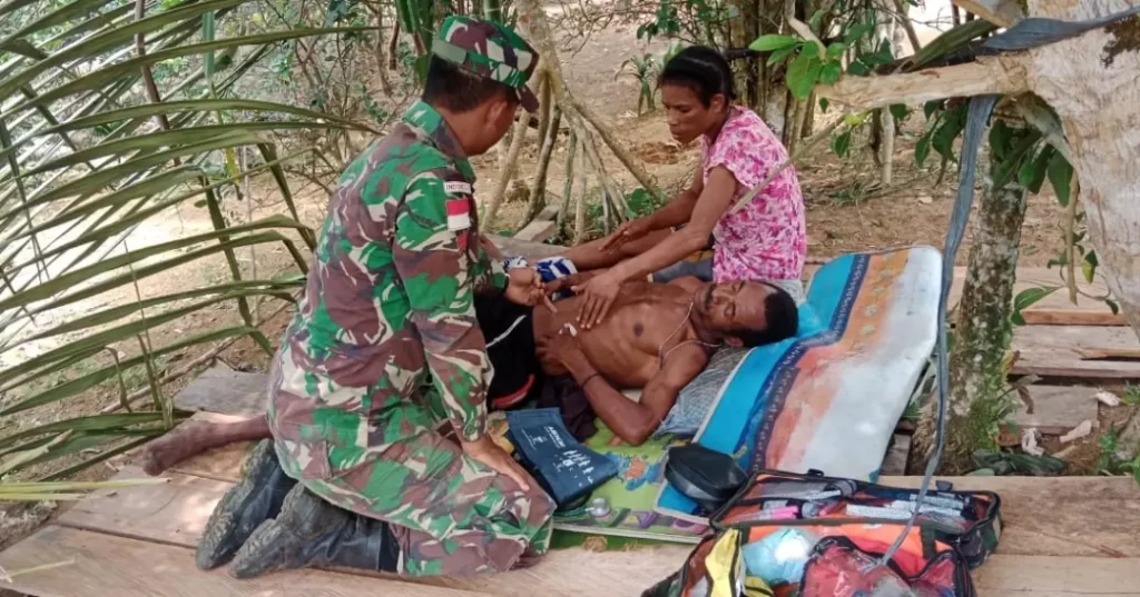 Dengan Sigap Tim Kesehatan Satgas Pamtas RI-PNG Yonif 126/KC Pos Somografi memberikan pelayanan kesehatan kepada Alex Full (44) masyarakat Kampung Somografi, Distrik Web, Kabupaten Keerom.