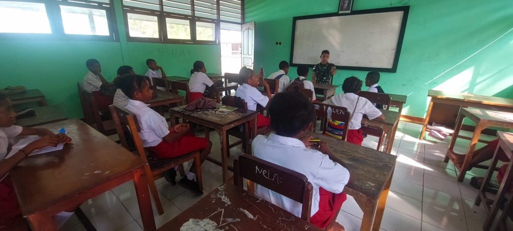 Personel Satgas Yonif 126/KC Pos Waris menjadi guru pendidik di SD Kanandega Kampung Banda, Distrik Waris, Kabupaten Keerom.