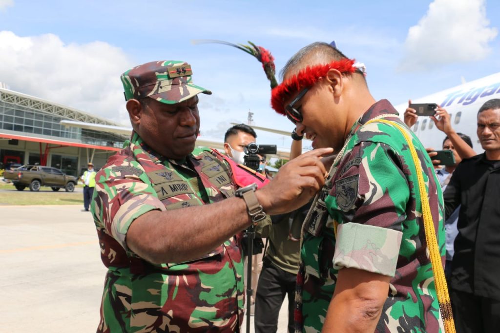 Wamena – Dandim 1702/JWY Letkol Cpn Athenius Murip, S.H.,M.H menyambut kedatangan Danrem 172/PWY Brigjen TNI Juinta Omboh Sembiring, S.H.,S.E di Bandara Wamena. (26/10/2022)