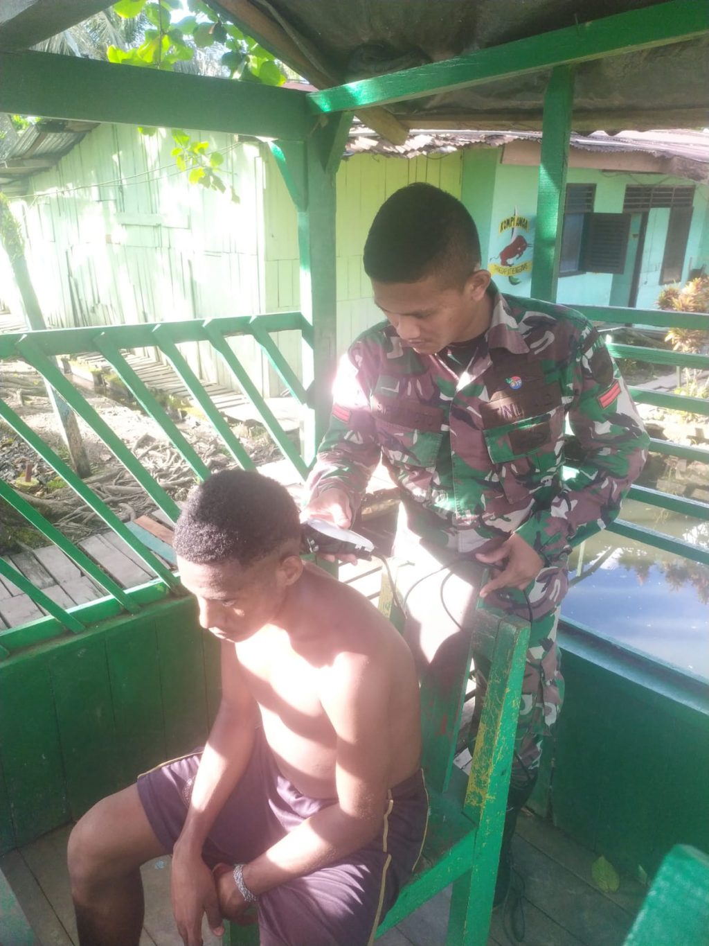 Danpos Arso Tami Lettu Inf Muliobri Prabudi mengajarkan anak-anak sekitar pos dengan memangkas rambut sekaligus memberi pengertian bahwa menjaga kerapian merupakan suatu hal yang utama untuk menjaga kesehatan diri.