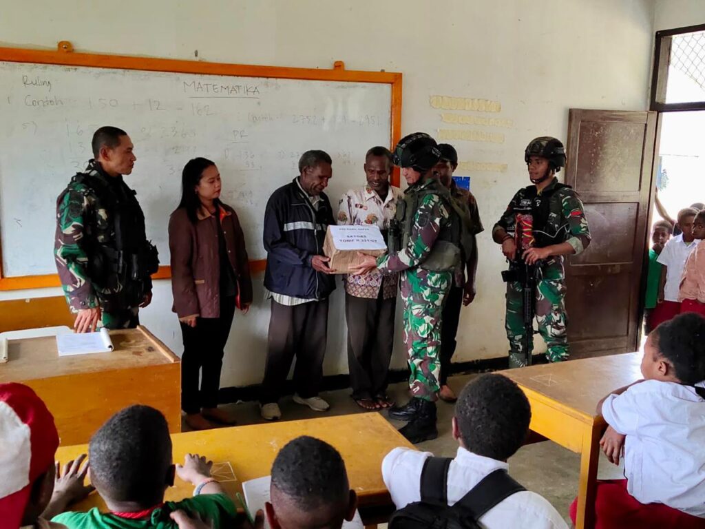 Guna meningkatkan motivasi belajar para pelajar diwilayah pedalaman Papua, Satgas Yonif Raider 321/GT/13/1 Kostrad Pos Napua berikan bantuan gadik dan beberapa kotak yang berisi perlengkapan sekolah kepada siswa-siswi di SD YPGI Napua Distrik Napua, Kabupaten Jayawijaya, Papua.