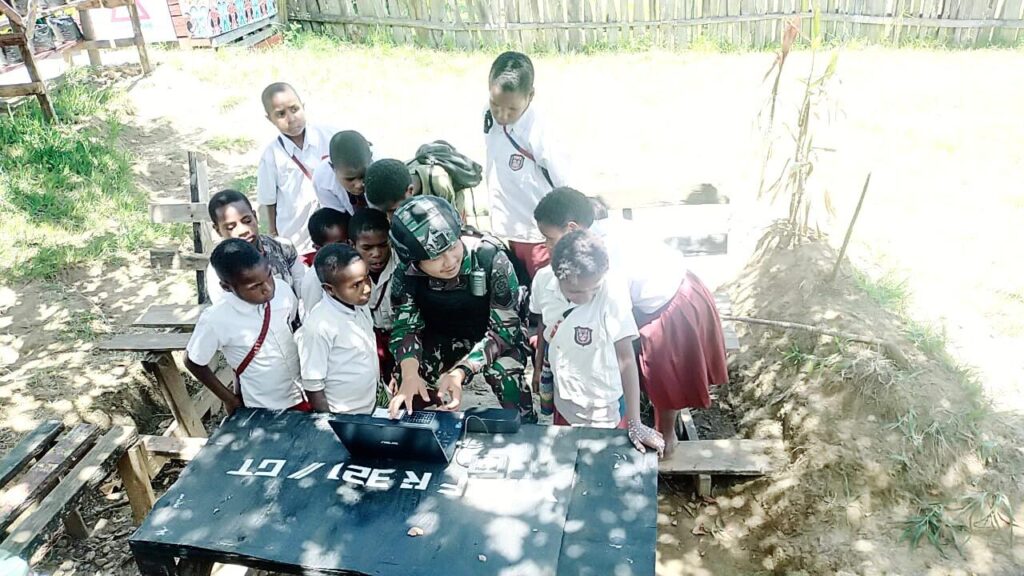 Dalam rangka memberikan pengetahuan tentang teknologi dan informatika, Personel Satgas Yonif Raider 321/GT/13/1 Kostrad Pos Napua memperkenalkan cara menggunakan Laptop kepada anak-anak pedalaman di Kampung Napua, Distrik Napua, Kabupaten Jayawijaya, Papua.