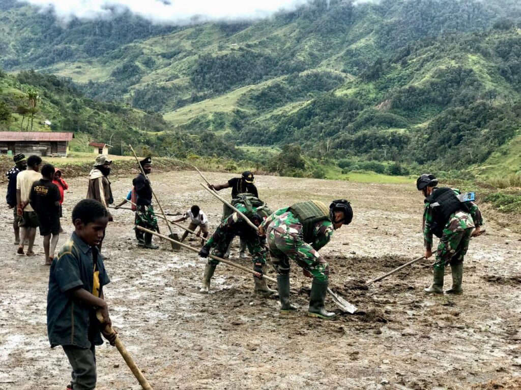 Personel Satgas Yonif Raider 321/GT/13/1 Kostrad Pos Yigi bersama Masyarakat Distrik Yigi gotong royong membangun dan membersihkan Bandara bertempat di Distrik Yigi, Kabupaten Nduga, Papua.