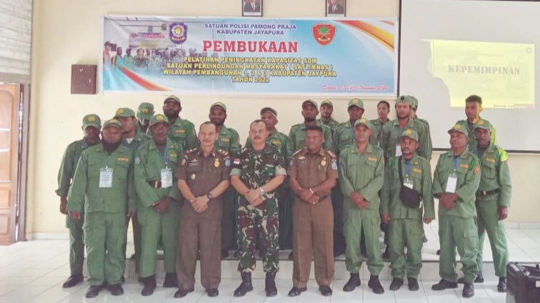 Dalam rangka upaya meningkatan kapasitas SDM Sat Linmas (Satuan Perlindungan Masyarakat) dan Satpol PP Wilayah Pembangunan 1,2 dan 3 Kabupaten Jayapura Ta.2022, Danramil Mayor INF Suprapto memberikan materi tentang kesadaran bela negara.