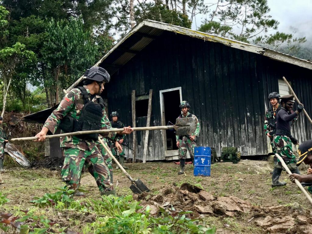 Dalam rangka membantu meningkatkan perekonomian masyarakat di pedalaman Papua, Personel Pos Yigi Satgas Yonif Raider 321/GT/13/1 Kostrad, membantu Bapak Melly Kmarigi (45) membuka lahan kebun di depan rumahnya yang berada di Kampung Yigi, Distrik Yigi, Kabupaten Nduga, Papua.