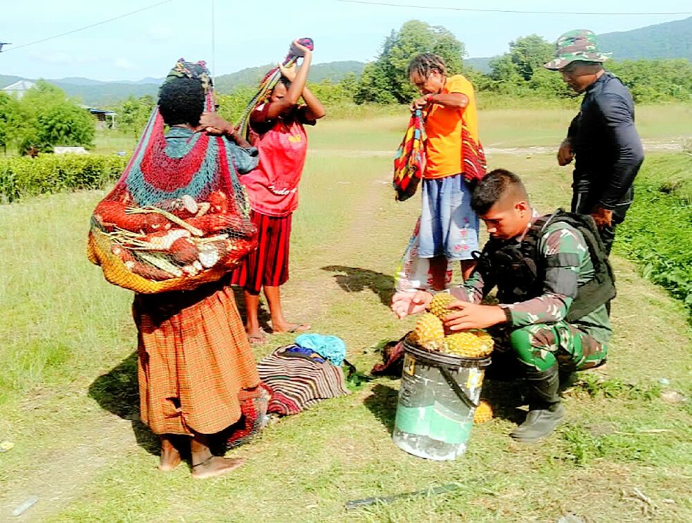 “Salah satu anggota kita atas nama sertu Ridho Lubis, melihat mama Papua yang sedang melintas dengan banyak bawaan hasil kebunnya berinisiatif bertanya untuk sekaligus membeli apa yang dibawa oleh mama,” jelas Letda Inf Farandika selaku Danton Waltis.