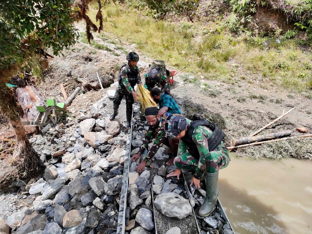 Satgas Yonif Raider 321/GT/13/1 Kostrad bersama warga bergotong royong membangun jembatan yang merupakan akses utama masyarakat di Distrik Dal, Kabupaten Nduga, Papua.