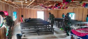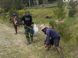 Prajurit Satgas Yonif Mekanis 203/AK Pos Malagay melaksanakan kegiatan Karya Bakti membersihkan lingkungan Sekitar Gereja Pinime, Distrik Malagay, Kab. Lanny...
