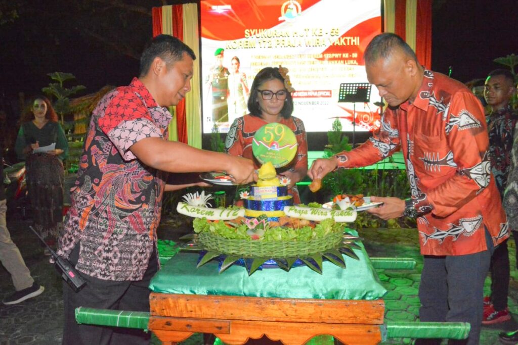 Jayapura – Korem 172/PWY menggelar perayaan peringatan Hari Ulang Tahun ke-59 bersama seluruh pemangku kepentingan, Tokoh Agama, Tokoh Adat, Tokoh Pemuda dan seluruh elemen masyarakat di wilayah Korem 172/PWY, bertempat di Lapangan Makorem 172/PWY, Abepura, Kota Jayapura, Sabtu (12/11).