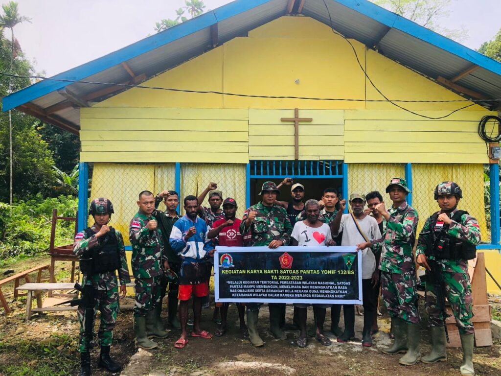 Kab.Keerom – Sebagai upaya mewujudkan kenyamanan saat beribadah, Pos Wembi Satgas Pamtas Yonif 132/BS mengajak masyarakat untuk gotong royong membersihkan gereja Santo Petrus Kp.Wembi, Distrik Mannem, Kab.Keerom, Senin (21/11)