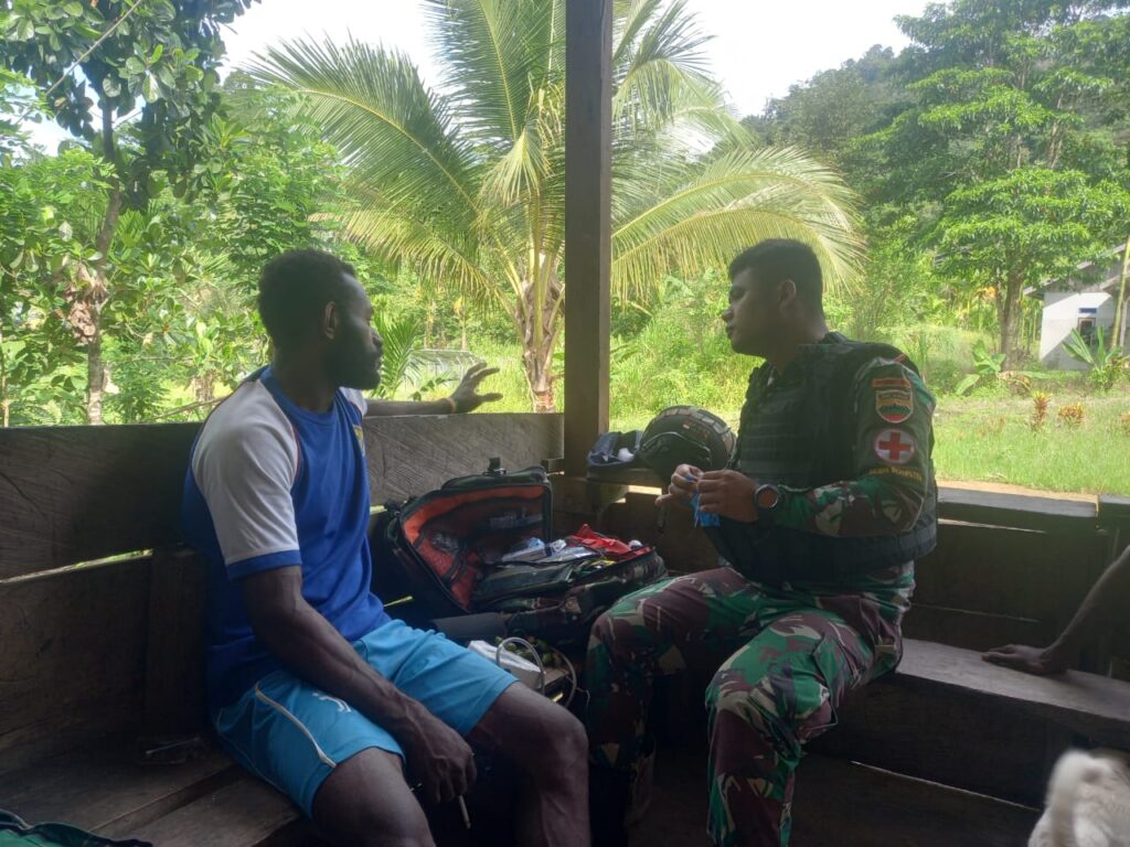 Disela-sela kegiatan anjangsana personel Satgas juga membantu kesulitan masyarakat disana yang mengalami sakit, demi memberikan pengobatan gratis kepada warga yang mengalami keluhan tentang kesehatan, kemudian personel satgas pos Km 76 memberikan pengobatan kepada warga yang mengalami sakit.