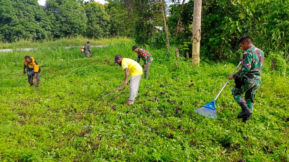 Kab.Keerom – Prajurit Satgas Pamtas Yonif 132/BS Pos Yamara menggelar Karya Bhakti bersama masyarakat di Kp.Suskun , Distrik Arso Timur, Kabupaten Keerom. Pada hari Senin (28/11).