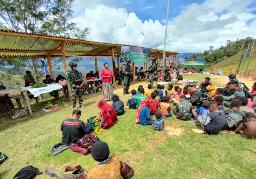 Satgas Yonif Mekanis 203/AK Pos Popome hadir di tengah-tengah masyarakat untuk mengajak anak-anak Papua di pegunungan tengah khususnya Distrik Popome belajar sambil bermain di Distrik Popome, Kab. Lanny Jaya, Papua, Kamis (03/11/2022).