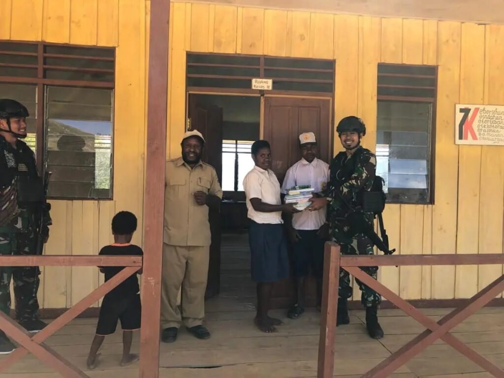 Personel Satgas Yonif Mekanis 203/AK Pos Balingga terus membantu perkembangan dunia Pendidikan di SMPN 1 Balingga Desa Binolanggen, Distrik Balingga, Kabuputen Lanny Jaya. Rabu (9/11/2022)