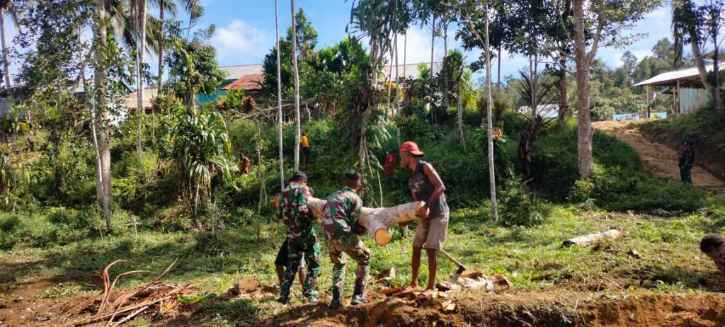 Keerom- Wujud kepedulian dan perhatian pembangunan dunia pendidikan, Satgas Pamtas Yonif 143/TWEJ Pos Tatakra bergotong-royong membersihkan lingkungan sekolah darurat di perbatasan RI-PNG Kampung Tatakra, Distrik Web , Kabupaten Keerom, Papua, Sabtu (12-11-2022)