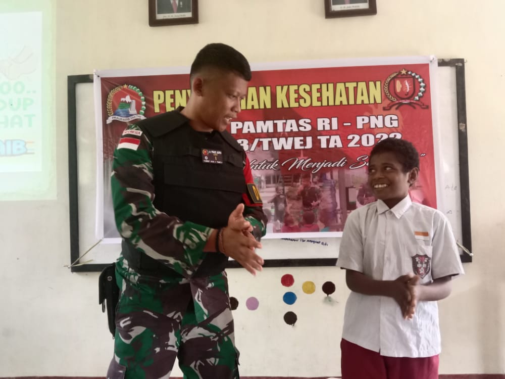 Keerom – Dokter Satgas Yonif 143/TWEJ bersama dengan Perwira Seksi Teritorial (Pasiter) Satgas Yonif 143/TWEJ Lettu Inf Bekti Handoko memberikan penyuluhan tentang Perilaku Hidup bersih dan sehat kepada para siswa SDN 1 Yowong, Kampung Yowong, Distrik Arso, Kab. Keerom, Papua. Kamis (24/11/2022)