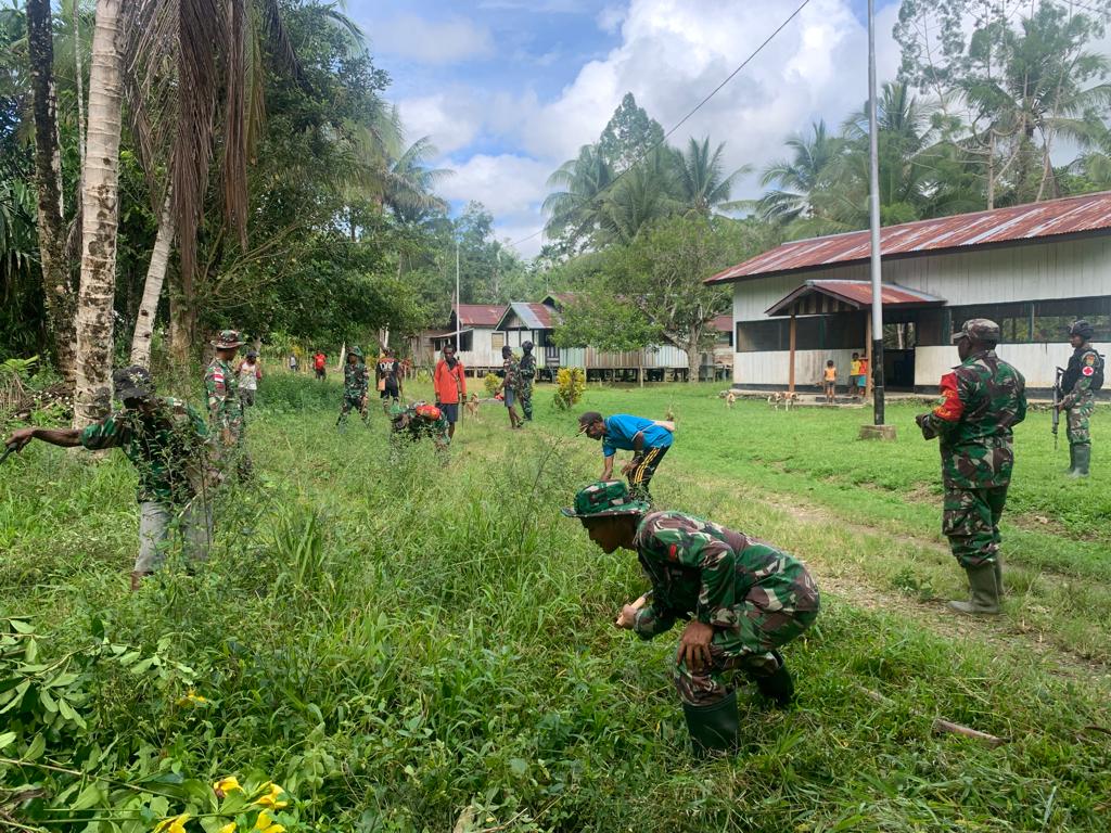 Sebagai bentuk kepedulian terhadap lingkungan Satgas Yonif 143/TWEJ yang bekerja sama dengan aparat Koramil 0701-07/Web mengajak masyarakat Kampung Umuaf untuk bersama – sama membersihkan lingkungan Balai Kampung setempat.