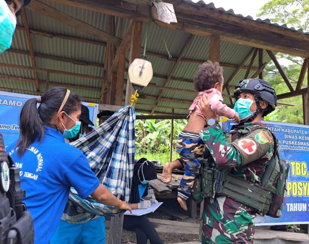 Mamberamo Tengah ~ Kepedulian terhadap tumbuh kembang anak-anak di wilayah penugasan Papua, Satgas Yonif Raider 142/KJ kembali bersinergi dengan Puskesmas Distrik Kelila menggelar Imunisasi di Kampung Timeria Distrik Kelila Kabupaten Mamberamo Tengah, Papua Pegunungan, Kamis (17/11/2022.)