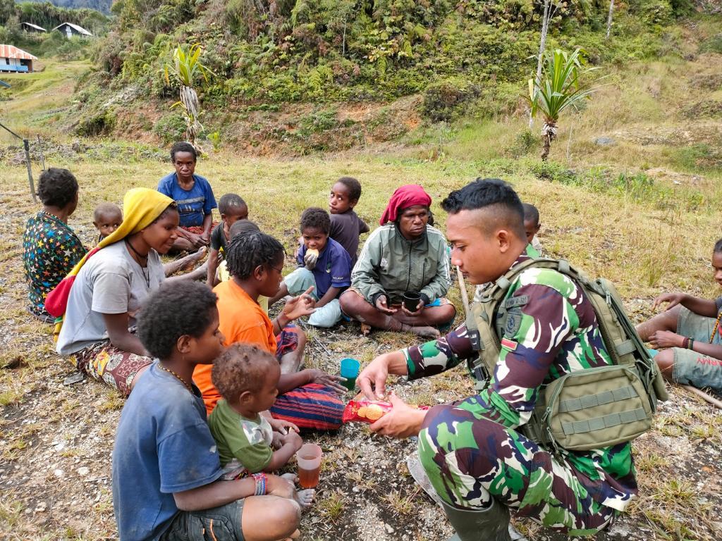 Setelah berkebun bersama masyarakat Satgas Yonif Raider 321/GT/13/1 Kostrad bagikan snack dan ngopi bersama masyarakat di Distrik Dal, Kabupaten Nduga, Papua.