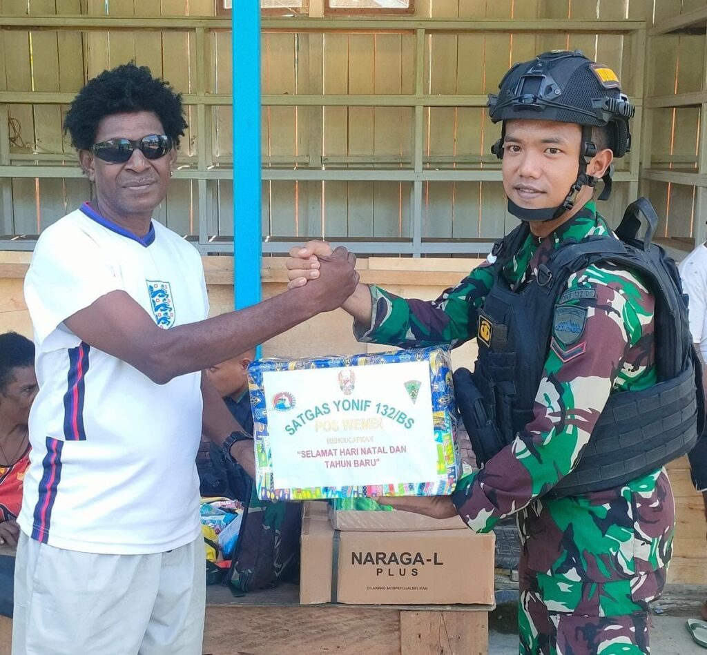 Kab.Keerom – Satgas Pamtas Yonif 132/BS Pos Wembi melaksanakan anjangsana ke rumah salah satu Tokoh Adat Kp.Wembi, Distrik Mannem, Kab.Keerom, Prov.Papua, Jumat (30/12/2022).