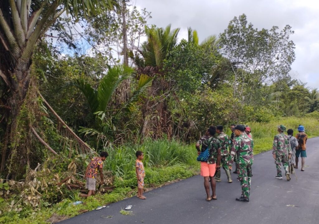 Keerom – Serdadu wira Pos Kalipao ajak warga masyarakat gotong royong membersihkan lingkungan di Kampung Yuwainda, Distrik Waris, Kab. Keerom, Papua, Rabu ( 30/11/2022 ).
