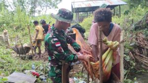 Pegunungan Bintang - Satgas Pamtas Yonif 143/TWEJ Pos Batom berkolaborasi dengan Satgas Damai Cartenz Mabespolri mengadakan Bakti sosial di Kampung...