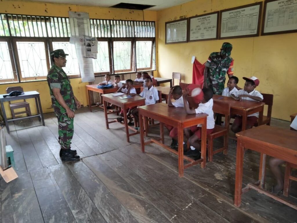 Dalam kesempatan kali ini Babinsa memberikan pelajaran materi wawasan kebangsaan terkait dengan pentingnya menjadi generasi penerus bangsa, cinta tanah air Indonesia terkusus di wilayah perbatasan Papua. Tidak bisa kita pungkiri, anak-anak jaman sekarang tidak tau itu apa arti dan maksud cinta tanah air.