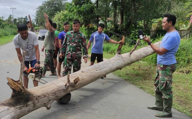 Dengan penuh semangat Satgas dan warga bahu membahu segera singkirkan pohon tumbang tersebut dan tidak memerlukan waktu yang lama pohon penghalang jalan tersebut dapat dibersihkan sehingga lalulintas menjadi kembali normal dan lancar.