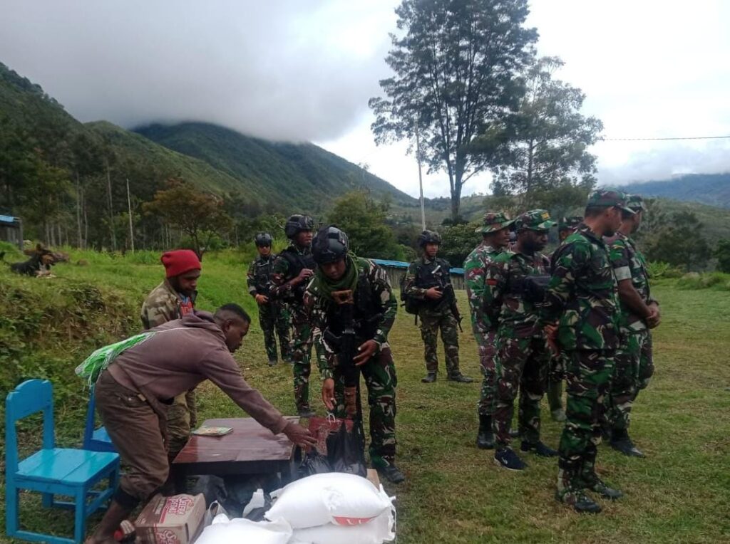 Satgas Yonif Mekanis 203/AK selalu hadir di tengah kesulitan masyarakat kali ini dengan memberikan sedikit bantuan bahan pokok berupa beras, gula, kopi dan mie serta telur kepada Perwakilan pihak Keluarga almarhum Bapak Arum Wenda yang meninggal Dunia di Distrik Makki, Kabupaten Lanny Jaya, Rabu (11/01/2023).