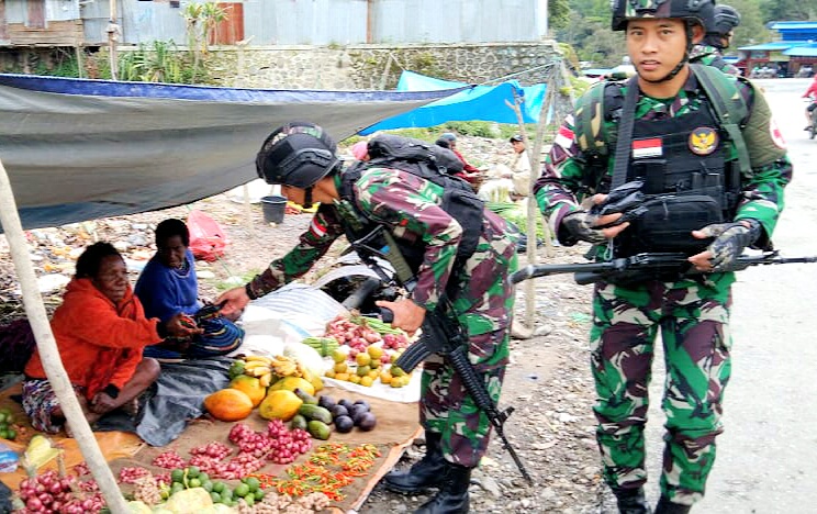 Selain melakukan patroli Simpatik, personel Pos Karubaga juga membagikan makanan berupa roti kepada masyarakat baik yang lewat maupun mama-mama yang sedang berjualan.