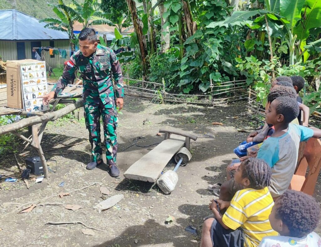 Yahukimo ~ Memanfaatkan waktu yang kosong demi memberikan sedikit ilmu pengetahuan terhadap anak-anak generasi penerus Bangsa kembali dilakukan oleh Personel Pos Kurima Satgas Yonif Raoder 142/KJ di Distrik Kurima, Kabupaten Yahukimo, Provinsi Papua Pegunungan, Jumat (13/01/23)
