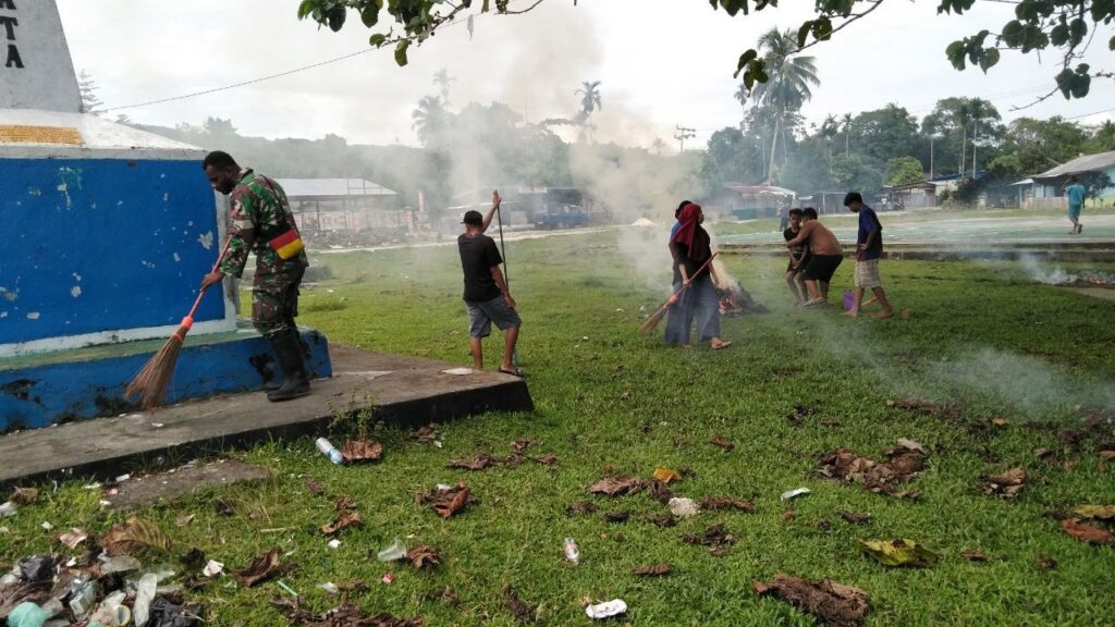 Sentani, Dalam mewujudkan lingkungan yang bersih dan asri anggota Koramil 1701-11/Nimboran, Kapten Arm Enos l. Furima bersama bapak Lurah Yan piter takayeitouw beserta Kepala puskesmas Genyem ibu Rohati Majid melaksanakan kerja bakti pembersihan lapangan Mandala Genyem, Kelurahan Tabri, Distrik Nimboran. Rabu (04/01/2023)