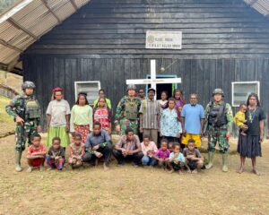 Guna meningkatkan keimanan dalam pelaksanaan tugas Personel Satgas Yonif Mekanis 203/AK mengadakan kegiatan ibadah bersama dengan masyarakat Jemaat Gereja Mowi...