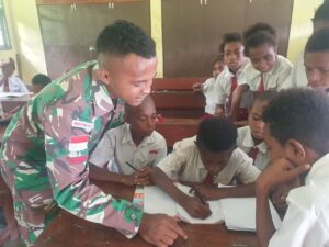 Kab.Keerom - Satgas Pamtas RI-PNG Yonif 132/Bima Sakti, Pos Ampas melaksanakan kegiatan belajar mengajar bersama Siswa SD Inpres Di Desa...