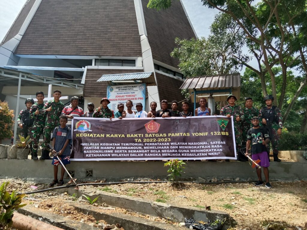 Kota Jayapura – Pos Kout (Skouw) Satgas Pamtas RI-PNG Yonif 132/BS menggelar kegiatan gotong royong bersama masyarakat untuk membersihkan Gereja GKI Eirene di Kompleks PLBN Skouw, Distrik Muara Tami,Kota Jayapura, Prov.Papua, pada Hari Selasa (17/01/2023).