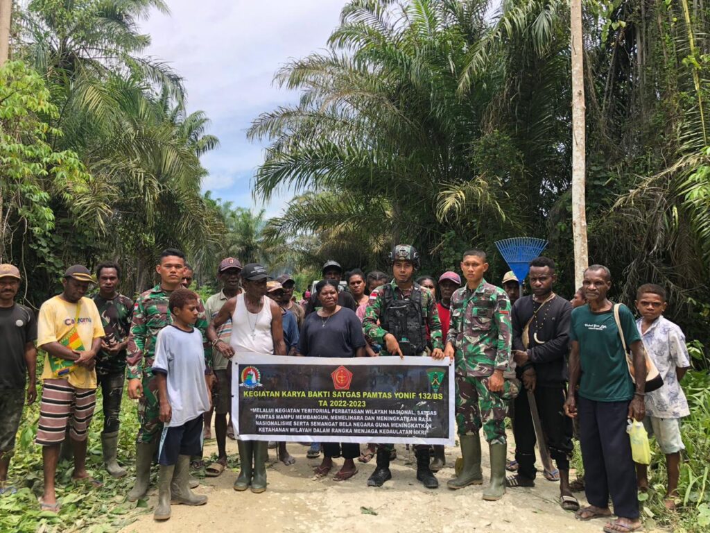 Sebagai wujud kepedulian terhadap kebersihan lingkungan di perbatasan Papua, Satgas Yonif 132/BS mengajak masyarakat untuk melaksanakan Karya Bhakti membersihkan kanan kiri jalan, kegiatan yang dipimpin oleh Bpk.Anaris Puaga Kepala Kampung.