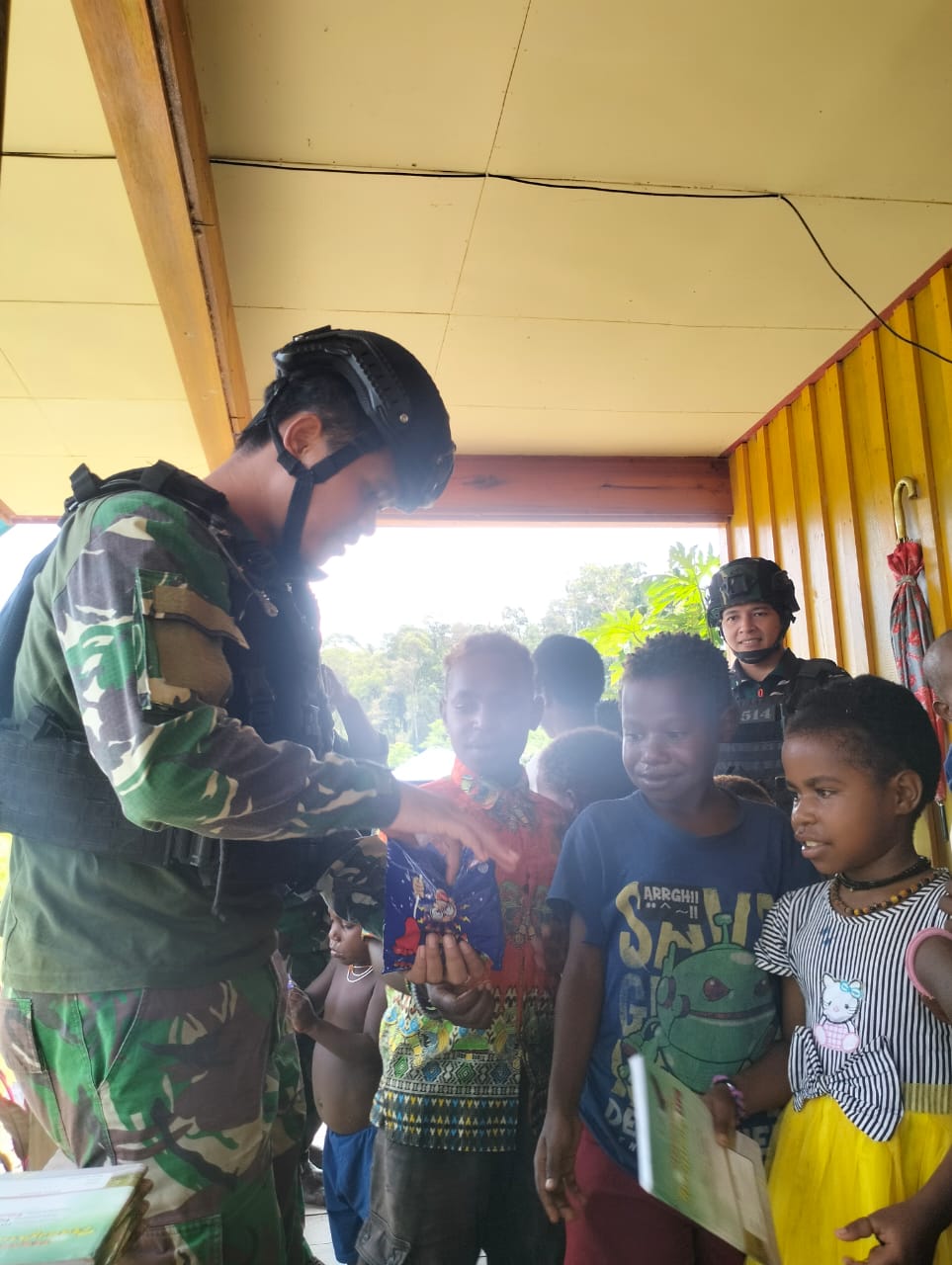 Namun secara perlahan melalui kegiatan ibadah bersama yang diikuti oleh personel satgas, mereka mulai terbuka dengan aparat. Pada kesempatan ini pula personel satgas Yonif Raider 514/SY berbagi kebahagiaan dengan anak-anak yang ada di kampung dengan membagikan buku bacaan, Permen dan mainan.