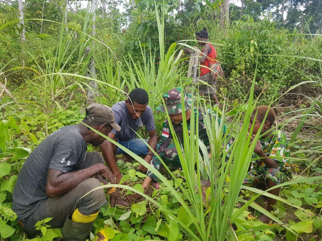 “Kami bantu warga buka lahan sekaligus turut menanam tanaman pangan guna pemenuhan pangan dan meningkatkan ekonomi warga”, tambah Dankipur.
