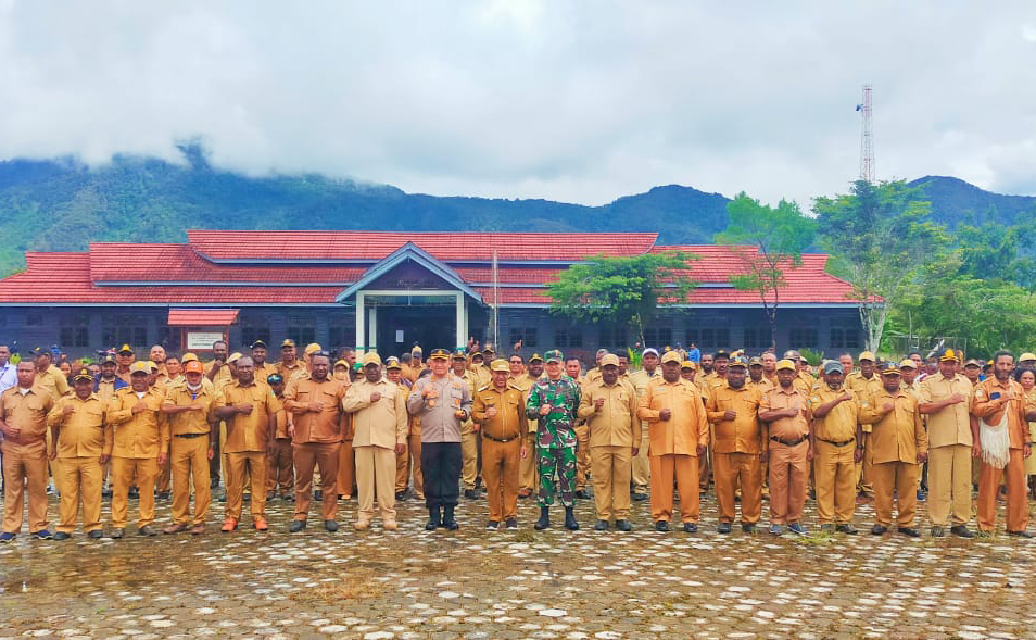 Oksibil – TNI – Polri dan ASN Pemerintah Daerah Kab. Pegunungan Bintang menggelar apel gabungan yang dipimpin oleh Bupati Pegunungan Bintang Spei Yan Bidana, S.T., M.Si., bertempat di Lapangan Pemda Pegunungan Bintang, Kampung Mobib Silibib, Distrik Oksibil, Kab. Pegunungan Bintang, Senin (16/1).