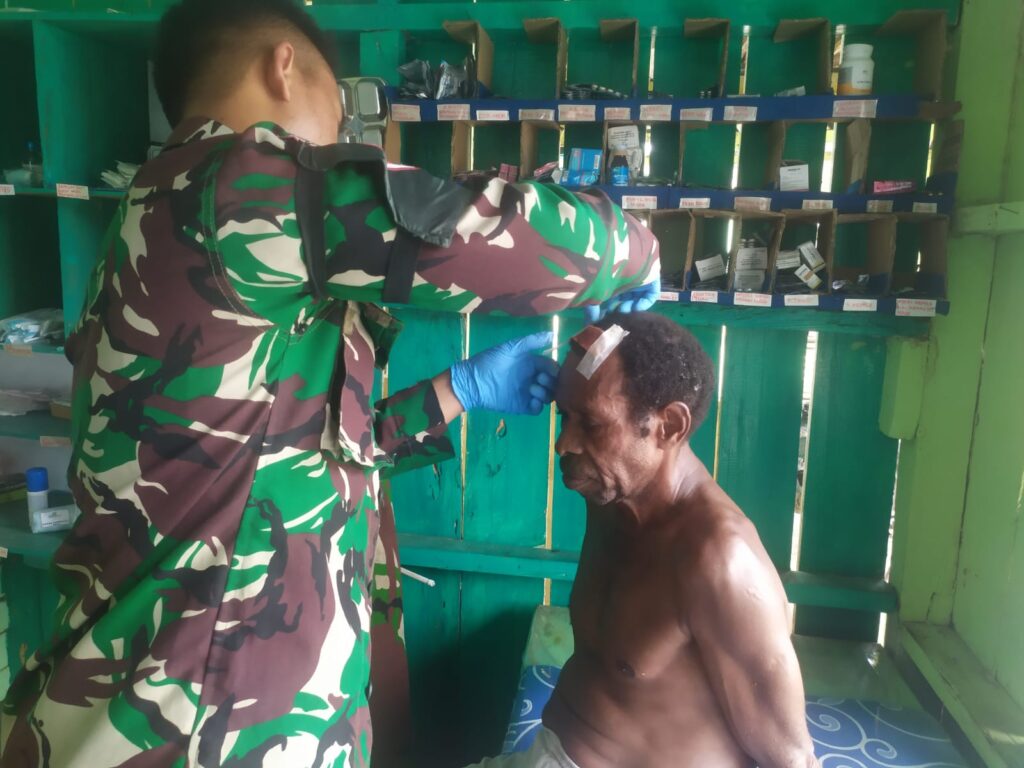 Kab.Keerom – Pos Arso Tami Satgas Pamtas Yonif 132/BS memberikan pertolongan pertama kepada masyarakat Di Desa Workwana, Distrik Arso, Kab.Keerom, Prov.Papua, Pada Hari Minggu (08/01/2023).