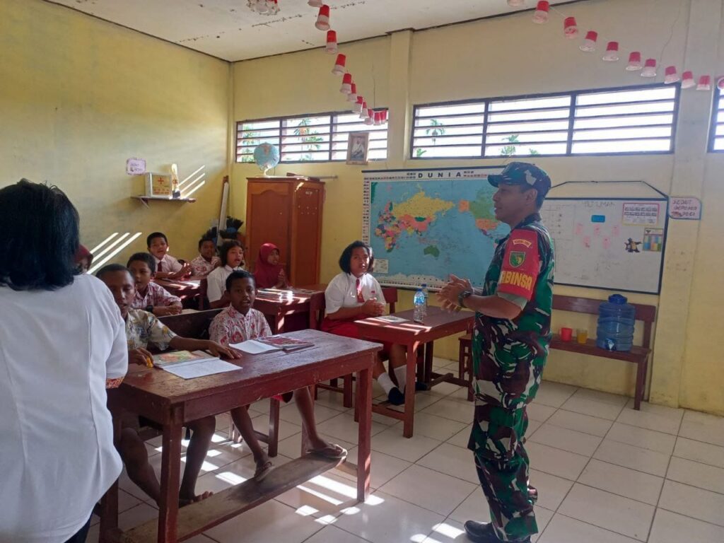 Jayapura, Aksi serbuan Babinsa Koramil 1701-22/Muara Tami, Pelda H. Fatah dan Koptu Agus serbuan di SDN 1 Koya Barat, Distrik Muara Tami, guna menanamkan jiwa Nasionalisme kepada siswa siswi. Rabu (1/2/2023)