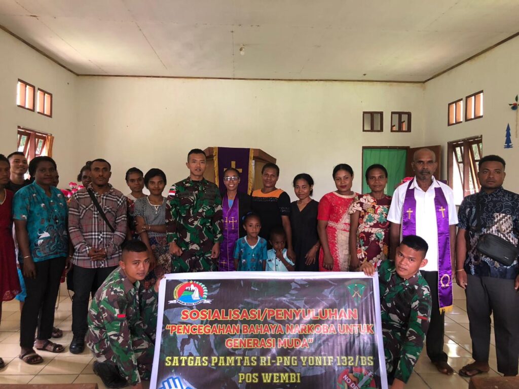 Kab.Keerom – Satgas Pamtas RI-PNG Sektor Utara Yonif 132/BS Pos Wembi melaksanakan penyuluhan bahaya penyalahgunaan narkoba bagi generasi muda Di Kp.Piyawi, Distrik Mannem, Kab.Keerom, Provinsi Papua, Selasa (21/02/2023).