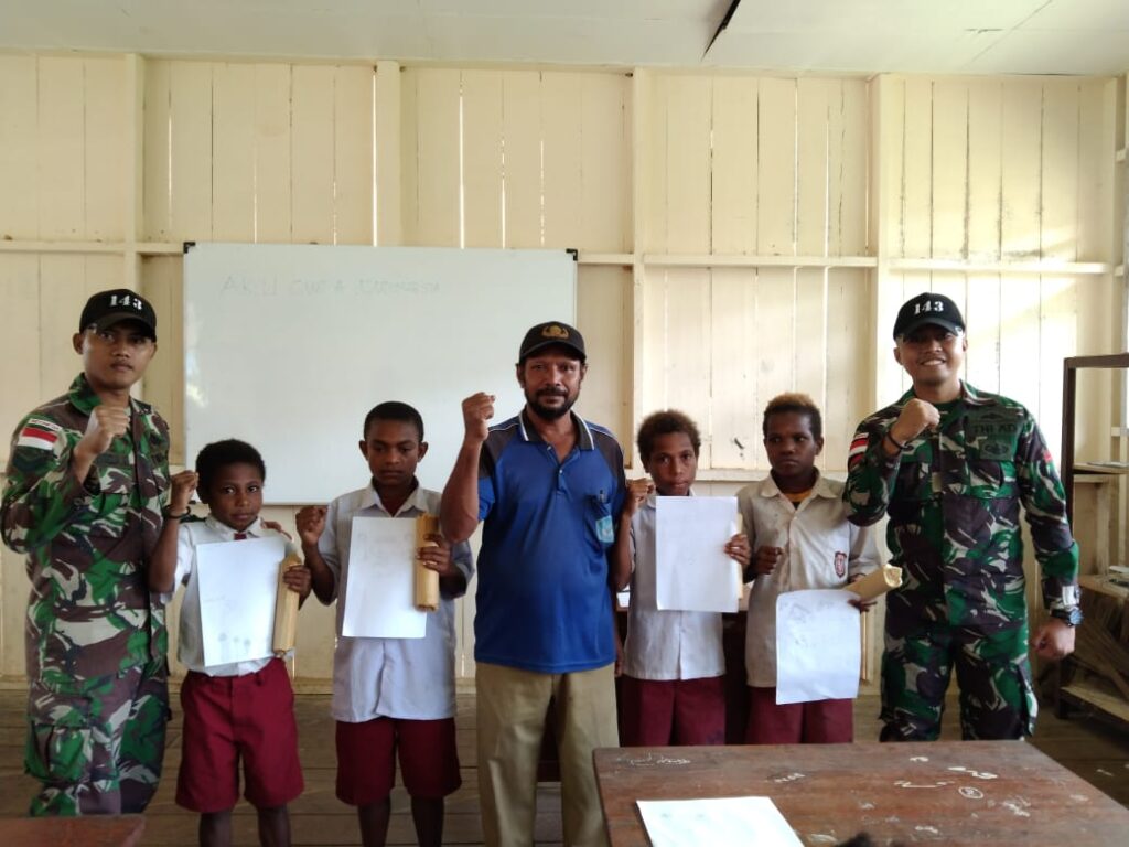 Keerom – Guna menggali potensi dan mengetahui bakat siswa di pedalaman Papua, Satgas Yonif 143/TWEJ mengadakan lomba mewarnai di SDN Inpres Yabanda, Kampung Yabanda, Distrik Yaffi, Kab. Keerom, Papua, Selasa (21/02/2023).